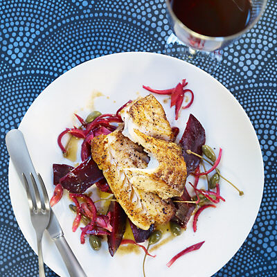 Bryn smöret i en kastrull under vispning tills det får en mörk gyllene färg. Ringla smöret över fisken och rödbetorna vid servering.